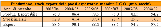 Il mercato internazionale durante il 2008 è stato caratterizzato da una forte volatilità delle quotazioni internazionali, che ha visto la media degli Indicatori di Prezzo ICO crescere nella prima metà dell’anno per poi diminuire in misura consistente nell’ultimo trimestre. Nell’anno di raccolto 2007/08 a fronte di una produzione esportabile di 83.5 milioni di sacchi, le esportazioni dichiarate dai paesi produttori sono ammontate a 94.3 milioni di sacchi e gli stocks di qualità esportabile all’inizio dell’anno di raccolto 2008/09 risultano ulteriormente ridotti. La situazione dal punto di vista del valore delle esportazioni e quindi delle entrate dei paesi esportatori relative alle spedizioni di caffè, risulta decisamente più soddisfacente. Un quadro accurato dell’andamento delle entrate dei paesi produttori riguardanti l’export di caffè negli ultimi quarantacinque anni è fornito nella allegata tavola XIX. Sulla base delle stime più recenti effettuate da qualificati organismi internazionali, le esportazioni per l’anno di raccolto 2008/09 (ultima colonna della tavola di seguito riportata) dovrebbero risultare più elevate dei volumi relativi alla produzione esportabile ed il volume degli stocks iniziali relativi all’anno di raccolto 2009/10 viene stimato in ulteriore calo.