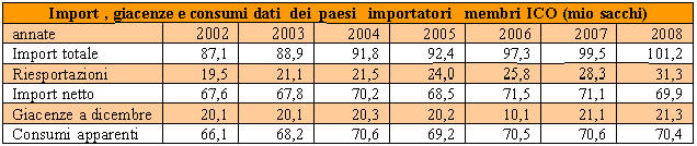 Per venire ai dati più recenti, le rilevazioni statistiche indicano che l’andamento delle esportazioni fa segnare un significativo incremento. Infatti in base ai dati relativi ai primi dieci mesi dell’anno caffeicolo in corso (ottobre 2008/luglio 2009) le esportazioni sono ammontate a 82.3 milioni di sacchi, a fronte dei 80.2 milioni dello stesso periodo dell’anno precedente. Gli imbarchi di caffè “Colombiani dolci” fanno registrare una flessione; sostanzialmente invariati i volumi di caffè “Altri dolci” esportati; particolarmente accentuata invece la crescita degli imbarchi dei caffè “Brasiliani Naturali” e dei “Robusta”. Come si rileva dalla tavola in appresso, nel 2008, a fronte di un incremento delle importazioni totali e delle riesportazioni, le giacenze nei paesi Membri importatori risultano in ulteriore crescita e il dato riguardante i consumi apparenti si attesta su un livello lievemente più basso di quello dell’anno precedente. Le importazioni nette dei paesi non-Membri fanno segnare una ulteriore crescita, attestandosi intorno ai 27 milioni di sacchi. Mentre nell’anno in corso i consumi apparenti in alcuni paesi Membri tradizionali importatori hanno arrestato la crescita, le giacenze nei paesi importatori e nei punti franchi vengono stimate in aumento rispetto ai livelli dell’anno precedente.
