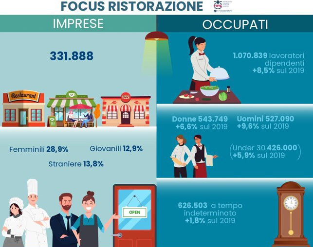 Il 28,9% delle imprese è gestito da donne, con una più alta incidenza nel canale bar (33,1% del totale). Le imprese guidate da giovani under 35 sono il 12,9% del totale, concentrate principalmente nel segmento ristoranti (60,3%), mentre le attività sotto il controllo di imprenditori stranieri sono oltre 50mila (circa il 14% del totale).