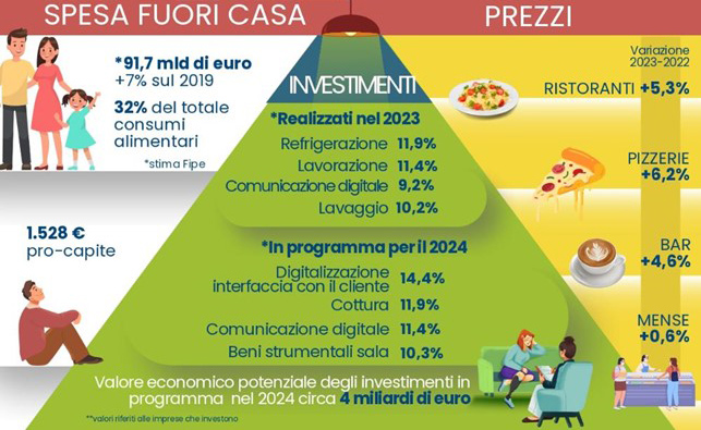 E per il 2024 le imprese annunciano un piano di investimenti che sfiora i 4 miliardi di euro. Sostenibilità e innovazione, infatti, sono i trend che caratterizzano il settore. Da un lato, circa 9 ristoranti e bar su 10 hanno adottato misure concrete per il controllo dei consumi energetici e il rispetto dell’ambiente. Dall’altro, oltre l’80% delle imprese ha introdotto uno o più strumenti digitali all’interno dei propri locali.