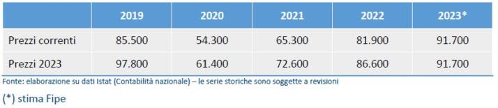 Nel complesso, i consumi alimentari in Italia sono stati nel 2023 pari a circa 287 miliardi di euro , di cui 195 miliardi di euro in casa e 92 miliardi di euro fuori casa). Il 2023 segna la definitiva ripresa del mercato dei consumi fuori casa con una crescita nominale del +7% sul del 2019. A prezzi costanti, tuttavia, questi consumi sono ancora sotto al livello del 2019 di sei punti percentuali.