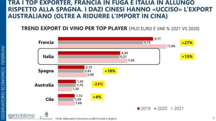 Se il mercato interno ha confermato la sua crescita, il 2021 ha visto un nuovo record per le bevande alcoliche nazionali fuori dai nostri confini.  Le esportazioni di vino italiano hanno superato i 7 miliardi di euro, in crescita del 13% sul 2020. Anche in questo caso la maggiore crescita è stata segnata dalle bollicine, grazie alle eccellenti performance del Prosecco che ha messo a segno un +31,5% rispetto al 2020; seguono i rossi fermi DOP della Toscana (+15%), i rossi DOP del Piemonte (+17,4%), i bianchi DOP del Veneto (+12,9%) e i rossi DOP del Veneto (+8,9%).
