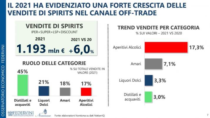 Le vendite di spiriti sono cresciute del 6,5% nel 2021 vs il 2020, arrivando a 1,2 miliardi euro, registrando progressi in tutte le categorie: i best performer sono gli Aperitivi alcolici (+17,3%), seguiti da Amari (+7,1%), Liquori dolci (+3,3%) e Distillati e Acquaviti (+3%). Segno meno invece per il comparto degli Aceti che ha registrato vendite per 133 milioni di euro, con l’eccezione positiva del balsamico, le cui vendite sono cresciute del 3,5% in valore.