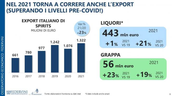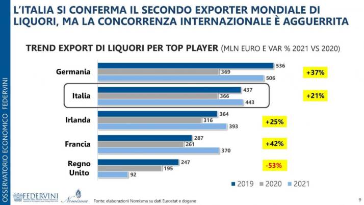 Ancora più rilevante la crescita dell’export di spiriti che ha superato gli 1,3 miliardi di euro nel 2021, +23% rispetto al precedente anno, con l’Italia che si conferma il secondo paese esportatore di liquori dopo la Germania ma ben prima di Irlanda, Francia e Regno Unito.