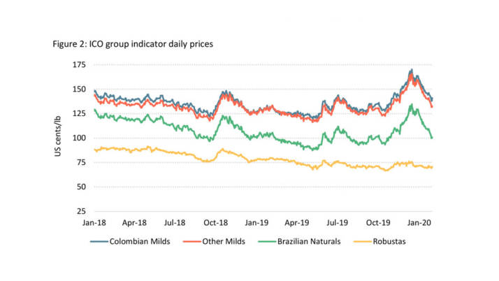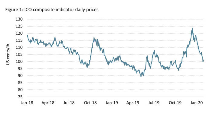 Dopo due mesi di aumenti, l’indicatore composito ICO è sceso dell’8,9% a 106,89 cent / lb nel gennaio 2020. Il prezzo giornaliero del composito ICO variava tra 99,78 cent / lb il 29 gennaio e 115,18 cent / lb il 2 gennaio. Il raccolto brasiliano 2020/21, che sarebbe stato un anno del suo ciclo biennale di Arabica, e una più ampia incertezza macroeconomica esercitavano una pressione negativa sul mercato.