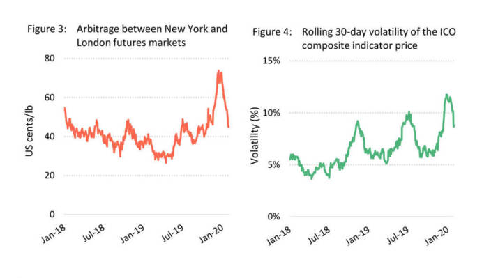 La volatilità dell’indicatore composito ICO è aumentata di 0,9 punti percentuali al 10,6% nell’ultimo mese. La volatilità di tutti gli indicatori Arabica è aumentata nel gennaio 2020: Brazilian Naturals aumento di 1,7 punti percentuali al 13,8%, gli Brasilian Milds di 1,5 punti percentuali all’11,1% e Colombian Milds di 1,2 punti percentuali al 10,7%. La volatilità dell’indicatore del gruppo Robusta è stata dell’8,1%, in calo di 0,7 punti percentuali rispetto a dicembre 2019.