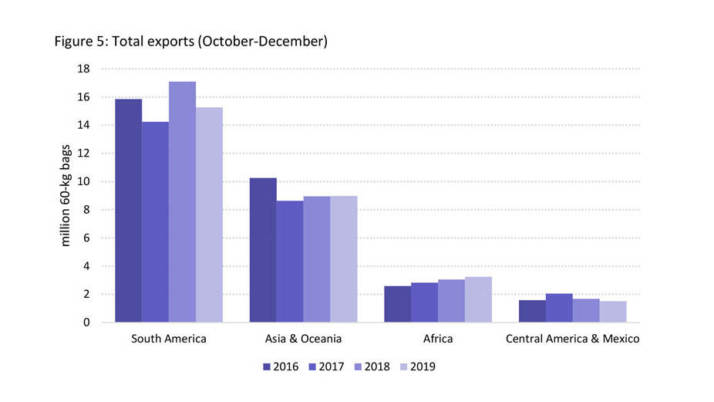 In Asia & Oceania, exports increased by 0.3% to 8.98 million bags, but are below the record of 10.26 million bags achieved in the first three months of 2016. Viet Nam was the leading exporter in the region, with shipments of 6.05 million bags, a 10.7% decrease on October to December 2018. During this period, exports contained mostly last season’s crop as harvesting of the new crop was still underway. However, Indonesia recorded a strong increase as it more than doubled its volume to 1.48 million bags while shipments from India rose by 0.5% to 1.07 million bags. Asia & Oceania accounted for 31% of total exports during the first three months of coffee year 2019/20.