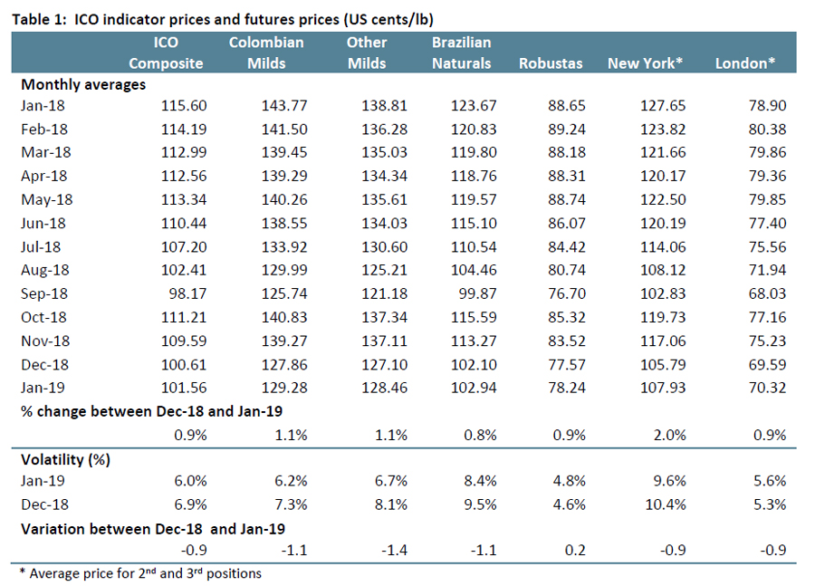 In January 2019, the ICO composite indicator rose by 0.9% to 101.56 US cents/lb as prices for all group indicators increased. After starting at a low of 99.16 US cents/lb, the daily composite indicator increased over the remainder of the month to end at a high of 103.58 US cents/lb on 31 January. The average price for Colombian Milds and Other Milds rose by 1.1% to 129.28 US cents/lb and 128.46 US cents/lb, respectively.
