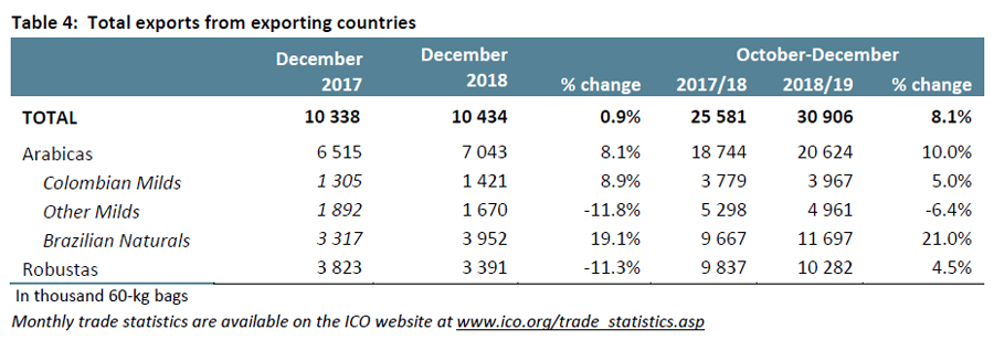 Nel mese di dicembre 2018, le esportazioni mondiali di caffè sono ammontate a 10,43 milioni di sacchi (631,800 tonnellate), lo 0,9% in più rispetto a dicembre 2017. Le spedizioni di prodotti naturali brasiliani e colombiani sono aumentate del 19,1% a 3,95 milioni di sacchi e 8,9% a 1,42 milioni di sacchi, rispettivamente. Tuttavia, le esportazioni di Other Milds sono diminuite 11,8% a 1,67 milioni di sacchi e le spedizioni Robusta sono diminuite dell’11,3% a 3,39 milioni di sacchi. Nei primi tre mesi del 2018/19, le esportazioni totali sono aumentate dell’8,1% a 30,91 milioni di sacchi. Le esportazioni di tutti i tipi, ad eccezione di Other Milds, sono aumentate rispetto ai primi tre mesi del 2017/18, guidate dalle spedizioni di prodotti naturali brasiliani, che sono aumentate del 21% a 11,7 milioni di sacchi. Le esportazioni di colomian milds sono aumentate di 5% a 3,97 milioni di sacchi, mentre Robustas è cresciuto del 4,5% a 10,28 milioni di sacchi. Le esportazioni di Other Milds sono diminuite del 6,4% a 4,96 milioni di sacchi.