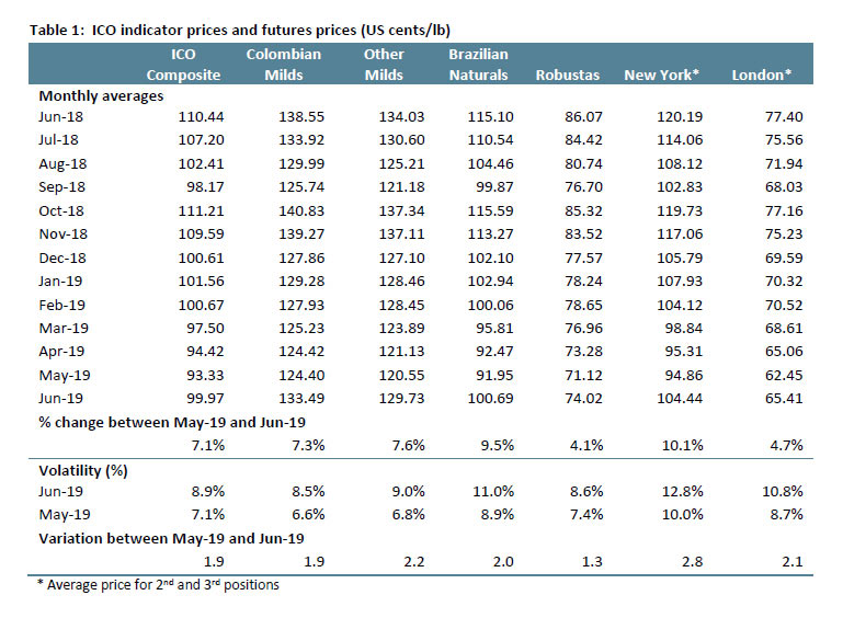 The ICO composite indicator averaged 99.97 US cents/lb in June 2019, 7.1% higher than in May 2019. This was the first increase in the monthly average since January 2019, when prices rose by 0.9% to 101.56 US cents/lb. The daily composite indicator ranged between 95.17 US cents/lb on 18 June and 105.25 US cents/lb on 28 June. The daily price rose above 100 US cents/lb for the first time since 18 February 2019 on 30 May and remained above that level on 9 out 20 days during the month of June.