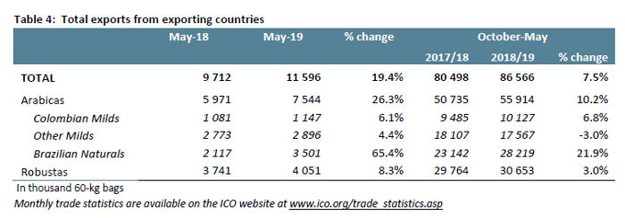 Le esportazioni globali nei primi otto mesi dell’anno caffè 2018/19 hanno raggiunto 86,57 milioni di sacchi, con un incremento del 7,5% rispetto allo stesso periodo di un anno fa. Le spedizioni di prodotti naturali brasiliani sono aumentate del 21,9% a 28,22 milioni di sacchi mentre le colombiane Milds sono aumentate del 6,8% a 10,13 milioni di sacchi. Le esportazioni di Robusta sono aumentate del 3% a 30,65 milioni di sacchi da ottobre 2018 a maggio 2019, mentre le altre muffe sono diminuite del 3% a 17,57 milioni di sacchi.