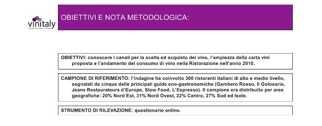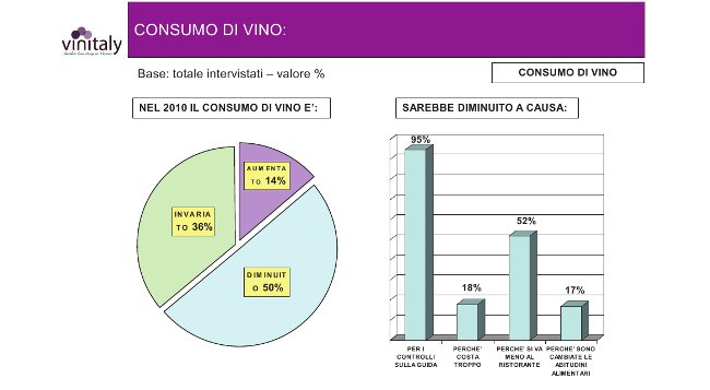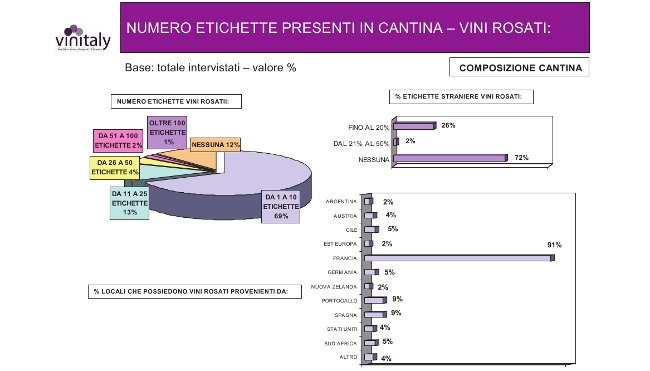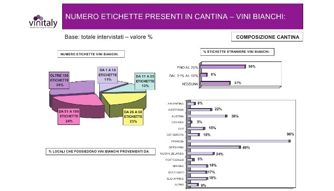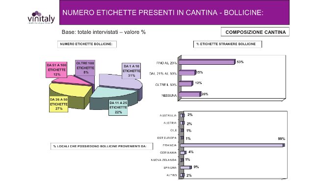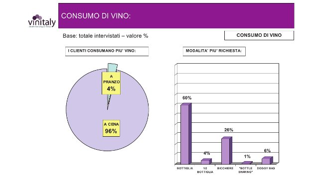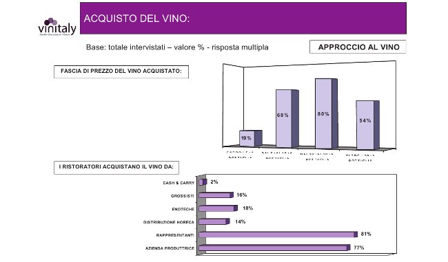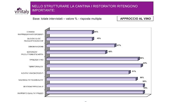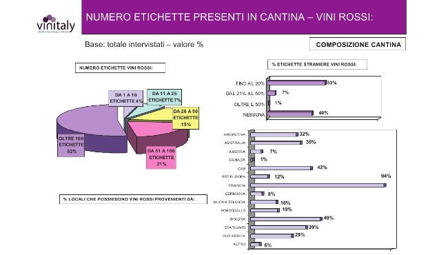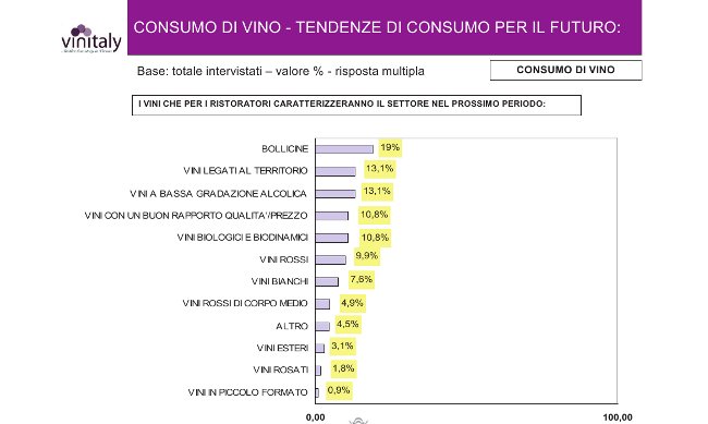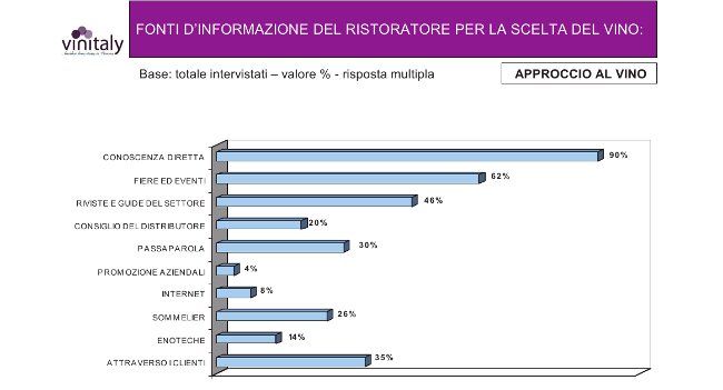 PREFAZIONE: Dal sondaggio “Vinitaly incontra la ristorazione italiana”, realizzato intervistando circa 300 ristoratori italiani estrapolati dall’incrocio delle principali guide italiane (Gambero Rosso, Il Golosario, Slow Food, L’Espresso, Jeunes Restaurateurs d’Europe), emerge che nel 2010 sono diminuiti i ristoranti con un’offerta di oltre 100 etichette e che i vini d’importazione sono ormai di casa nelle cantine dei ristoranti italiani. In particolare: l’80% ha in cantina vini spumanti non made in Italy, mentre il 63% e il 60% rispettivamente ha vini bianchi e rossi stranieri. Secondo l’85% degli intervistati, la scelta della bottiglia viene fatta dal cliente seguendo i consigli del ristoratore/sommelier, per il 73% in base al rapporto qualità/prezzo, per il 53% vale la notorietà del produttore, mentre per il 34% è importante la moda del momento. I gusti sembrano ancora in evoluzione, e secondo le previsioni dei ristoratori continuerà a crescere la richiesta di bollicine e di vini a bassa gradazione alcolica.Riferimento temporale: gennaio 2012