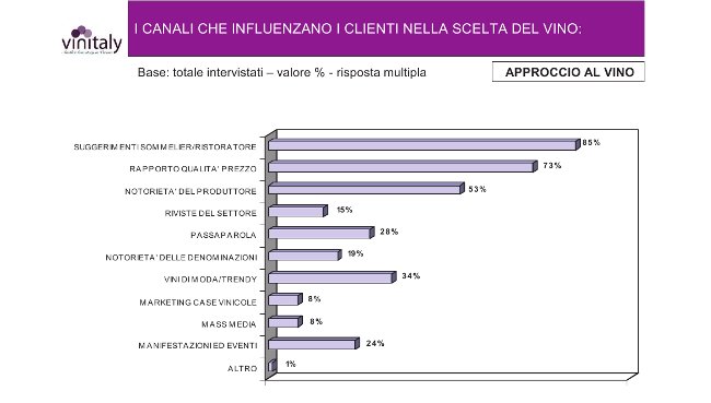 Il ruolo del ristoratore o sommelier nella scelta del vino al ristorante è in effetti ancora molto importante in quanto la maggior parte dei clienti affida loro la scelta del vino. Questo purtroppo rispecchia una ancor scarsa conoscenza/cultura del vino del consumatore medio italiano.