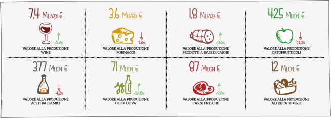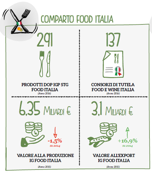 L’Italia, leader mondiale per numero di DOP IGP con 814 prodotti Food e Wine, raggiunge i 13,8 miliardi di euro di valore alla produzione nel 2015, per una crescita del +2,6% su base annua e un peso del 10% sul fatturato totale dell’industria agroalimentare nazionale.
