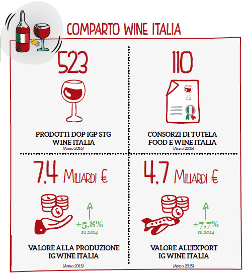 I vini DOP e IGP contano 523 riconoscimenti, una superficie iscritta pari a 494mila ettari e una produzione che arriva intorno al 50% del vino totale prodotto in Italia. La produzione di DOP e IGP nel 2015 è stata di oltre 23 milioni di ettolitri, per 2,84 miliardi di bottiglie (+2,4% sul 2014) e 7,4 miliardi di euro di valore alla produzione (+5,8%). L’export di vini DOP e IGP ha raggiunto nel 2015 i 14,1 milioni di ettolitri (+4,5%) per un giro d’affari da 4,7 miliardi di euro (+7,7%) e una quota dell’87% rispetto ai 5,4 miliardi complessivi delle esportazioni italiane di vino. Le prime dieci DOP rappresentano il 53% della produzione totale a volume e il 58% a valore: le prime cinque denominazioni (Prosecco DOP, Conegliano Valdobbiadene– Prosecco DOP, Chianti DOP, Asti DOP e Chianti Classico DOP) con più di 900 milioni di euro di valore alla produzione dello sfuso coprono oltre il 40% del totale. Nelle IGP le prime cinque indicazioni (Delle Venezie IGP, Veneto IGP, Terre Siciliane IGP, Toscano IGP e Emilia IGP) raggiungono complessivamente 439 milioni di euro di valore alla produzione dello sfuso e coprono oltre il 69% del totale.
