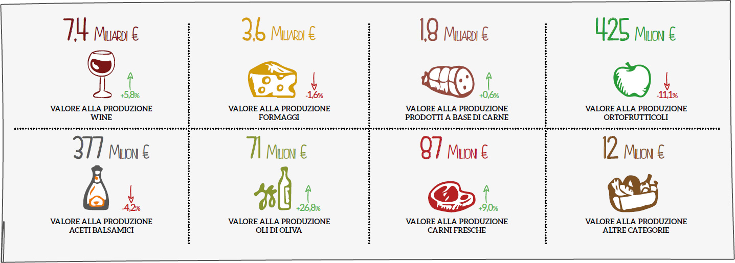 L’Italia, leader mondiale per numero di DOP IGP con 814 prodotti Food e Wine, raggiunge i 13,8 miliardi di euro di valore alla produzione nel 2015, per una crescita del +2,6% su base annua e un peso del 10% sul fatturato totale dell’industria agroalimentare nazionale.