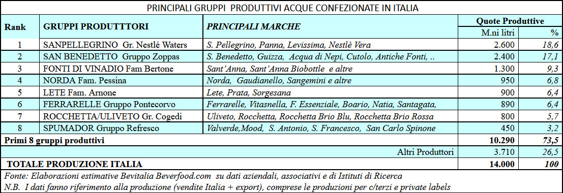 I primi 8 produttori (Sanpellegrino Nestlè Waters, San Benedetto, Fonti di Vinadio, Gruppo Norda, Lete, Ferrarelle, Cogedi, Spumador) assorbono oltre il 73% del totale produzione nazionale. Va sottolineato come il mercato italiano è uno dei pochi grandi mercati delle acque confezionate che non è dominato dalle grandi multinazionali del beverage. L’unica grande multinazionale che ha conquistato la leadership del mercato è Sanpellegrino (Nestlè Waters) mentre la Coca-Cola, pur operando sul mercato già da alcuni anni, è abbastanza lontana dalle posizioni di vertice; sono assenti, invece, le altre due grandi multinazionali delle acque confezionate (Danone e Pepsico).