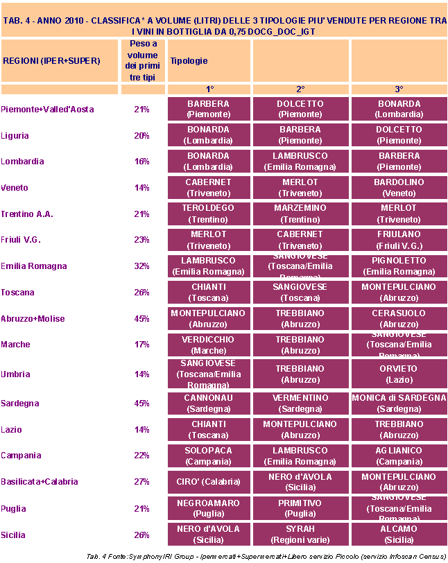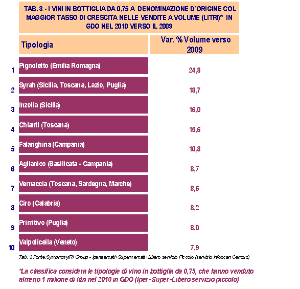 Le classifiche, realizzate incrociando i dati relativi a tipologia di vino e territorio per i vini a denominazione d’origine in bottiglia, vedono il Chianti ed il Lambrusco dividersi il podio, col Chianti che vende di più a valore (più di 54 milioni di euro) ed il Lambrusco che vende di più a volume (più di 14 milioni di litri). Seguono il Nero d’Avola ed il Montepulciano d’Abruzzo (vedi tabella 2). Interessanti novità si affacciano nella classifica dei vini “emergenti”, cioè quei vini col maggior tasso di crescita nel 2010 rispetto al 2009: al primo posto il Pignoletto con + 24,8%, seguito dal “multi regionale” Syrah (+ 18,7%) e dal siciliano Inzolia (+ 16%). Va notato che compaiono in questa speciale classifica, assai indicativa per individuare i trend di consumo, vini che non erano in questa classifica l’anno scorso come Aglianico, Vernaccia, Cirò e Valpolicella (vedi tabella 3).