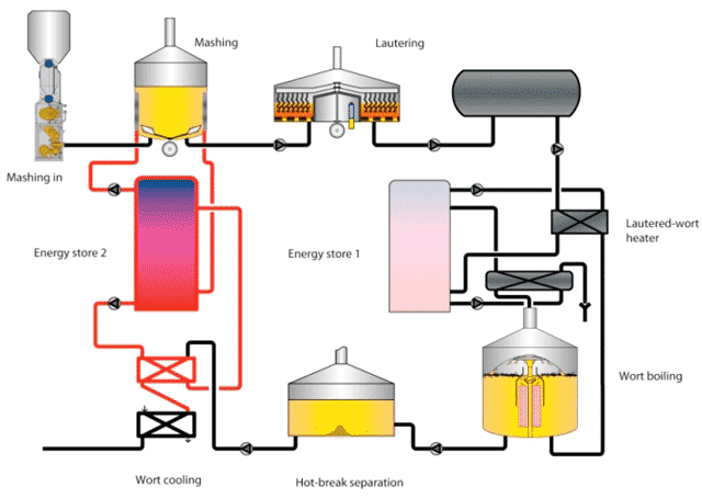 Una delle caratteristiche salienti della tecnologia di processo Krones è il risparmio energetico e, quindi, la gestione delle risorse. Dal punto di vista energetico, nei birrifici la produzione del mosto è la fase di processo che richiede la maggiore quantità di energia primaria sotto forma di energia termica. Qui trova applicazione un nuovo sistema di gestione energetica. Oltre che con il già noto sistema di recupero energetico tra il riscaldatore del mosto filtrato e la cottura del mosto, alimentato con il condensatore dei vapori della caldaia, il fabbisogno d’energia termica dei birrifici può essere ridotto sensibilmente recuperando energia anche nella sala di cottura. Per questo motivo dopo la cottura del mosto viene sottratta energia a un livello di temperatura elevato, che può essere utilizzata, ad esempio, per ridurre l’impiego di energia primaria nel processo di miscelatura o nell’impianto CIP. In tutti questi processi, infatti, il livello di temperatura è inferiore rispetto a quello di riscaldamento e cottura del mosto. Una condizione importante per la riuscita di questa soluzione è l’utilizzo del sistema di miscelatura ShakesBeer, che con i suoi dimple jackets consente di ottenere un trasferimento energetico elevato. Con questo nuovo concetto di recupero energetico, unito all’ottimizzazione dei dispositivi che consumano calore, è possibile risparmiare oltre il 20 percento di energia primaria nel processo di cottura: un birrificio con una produzione di 200.000 ettolitri, quindi, può risparmiare più di 250.000 kWh di energia termica l’anno.