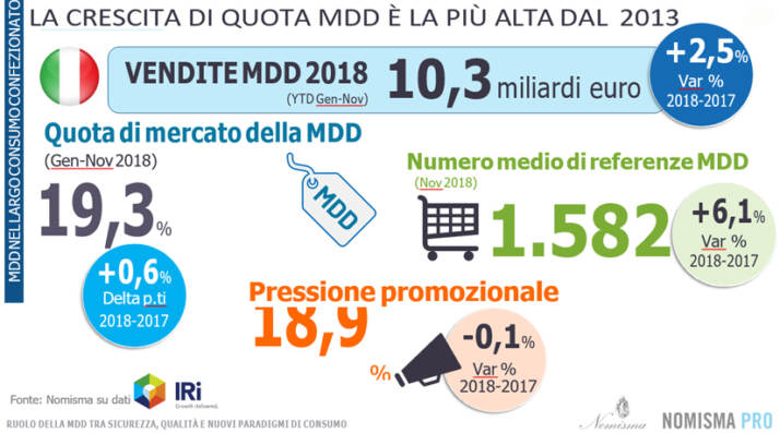 • VENDITE MDD IN AUMENTO NELLA DISTRIBUZIONE MODERNA: Nei primi 11 mesi del 2018 (Gen-Nov) le vendite hanno sfondato il muro dei 10 miliardi, quasi 1 acquisto su 5 effettuato nella distribuzione moderna è a marca del distributore, complice un ampliamento degli assortimenti (con un numero medio di referenze MDD nell’ultimo mese di 1.582, + 6,1% rispetto al 2017). La leva promozionale dei prodotti MDD risulta invece in linea con quella del 2017 (18,9% per la MDD, -0,1% rispetto al 2017).