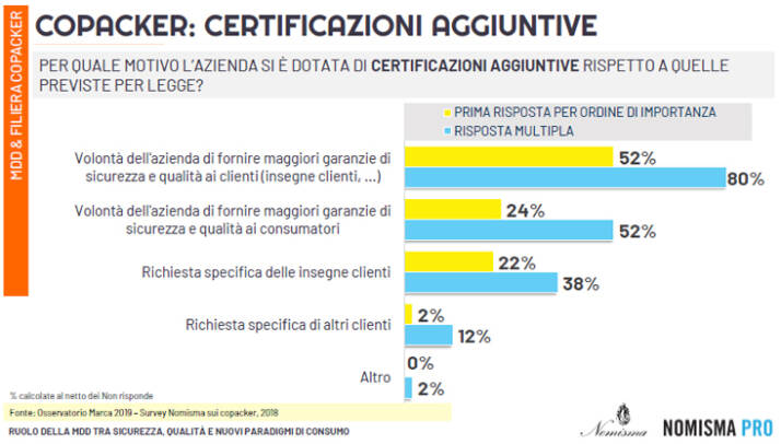 • Per quasi 1 azienda su 2 (46%) la GDO rappresenta una spinta a sviluppare prodotti che seguono disciplinari legati a certificazioni. La volontà di offrire maggiori garanzie di qualità ai propri clienti (insegne) è il primo elemento che spinge i copacker a dotarsi di certificazioni aggiuntive rispetto a quelle previste dagli obblighi di legge (80%). Il 52% delle aziende di copacking invece si dota di certificazioni addizionali spinti dalla volontà di offrire maggiori garanzie ai consumatori finali. In questo contesto è importante anche il ruolo svolto dai retailer: il 38% dei copacker, infatti, afferma di dotarsi di certificazioni sollecitato da specifica richiesta delle insegne clienti.