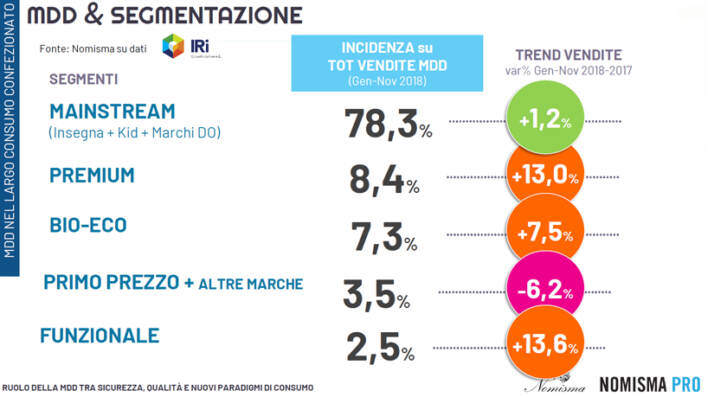 • LA MDD SI EVOLVE ANCHE NEI SEGMENTI: Nei primi 11 mesi del 2018 la crescita a valore della MDD è stata pari al 2,5%, con una progressione significativa nei segmenti funzionale (+13,6%, 2,5% delle vendite della MDD), premium (+13%; 8,4% delle vendite della MDD) e BIOECO (+7,5%, 7,3% delle vendite della MDD) e con una solida crescita – soprattutto se letta a confronto del trend registrato dal LCC – anche nel mainstream (+1,2%, 78,3% delle vendite della MDD).