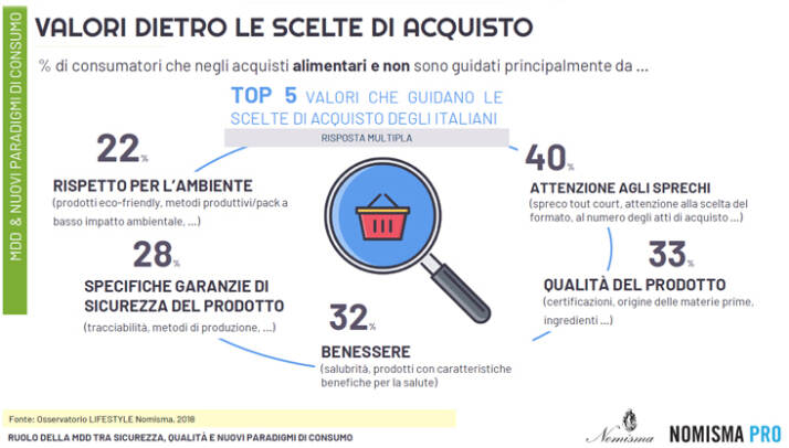 VALORI CHE GUIDANO GLI ACQUISTI: Attenzione agli sprechi (40%), qualità del prodotto garantita dalla presenza di certificazioni (33%) e ricerca di benessere – inteso come salubrità e caratteristiche benefiche per la salute – (32%) è la TOP3 dei valori che guidano le scelte di acquisto degli italiani. La sostenibilità fa sempre più parte della vita degli italiani: il 92% dichiara di fare la raccolta differenziata in casa (anche se l’intensità è ancora molto eterogenea) e il 70% di utilizzare elettrodomestici a basso consumo energetico. Anche a tavola si sceglie con un occhio attento alla salvaguardia dell’ambiente: sono 21,5 milioni le famiglie italiane che nel 2018 hanno acquistano prodotti alimentari bio in modo consapevole (81%).