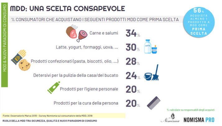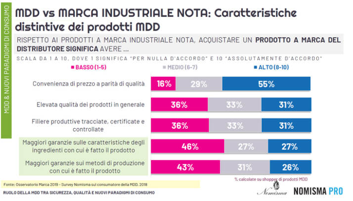 • Non solo valori, ma driver di scelta non solo di prodotto e ma anche di punto vendita/insegna. Per i consumatori acquistare MDD significa soprattutto mettere nel carrello “Convenienza a parità di qualità” (55% identifica tale attributo come coerente), “Elevata qualità in generale” (31%) e “Prodotti da Filiere tracciate, certificate e controllate” (31%). Scegliere un prodotto a Marca Del Distributore, quindi, non significa solo acquistare solo un prodotto, ma un insieme di valori e garanzie.