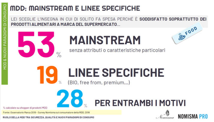 LA MDD GUIDA LA SCELTA DELL’INSEGNA: Il 53% di chi ha acquistato almeno un prodotto MDD nell’ultimo anno sceglie l’insegna in cui fa spesa di solito perché soddisfatto soprattutto dei prodotti alimentari MDD mainstream. Importante anche il ruolo giocato da linee specifiche di prodotti MDD (19%). È invece il 28% a scegliere l’insegna e quindi il pdv sia per entrambi i motivi.