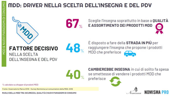 LA MDD È ANCHE UN FATTORE DI FIDELIZZAZIONE: Il 23% dei responsabili di acquisto sceglie sempre l’insegna (e quindi il punto vendita dove fare la spesa) per la qualità dei prodotti a marca del distributore che sono presenti in assortimento. Non solo, il 48% degli acquirenti consapevoli di prodotti MDD si dichiara disposto a rinunciare alla comodità di un PDV vicino a casa o al luogo di lavoro e percorrere della strada in più per raggiungere l’insegna che propone i prodotti MDD che preferisce. La marca del distributore rappresenta inoltre un possibile motivo di churn: il 40% è pronto a cambiare insegna se il PDV frequentato di solito, all’improvviso, smettesse di vendere i suoi prodotti MDD preferiti.