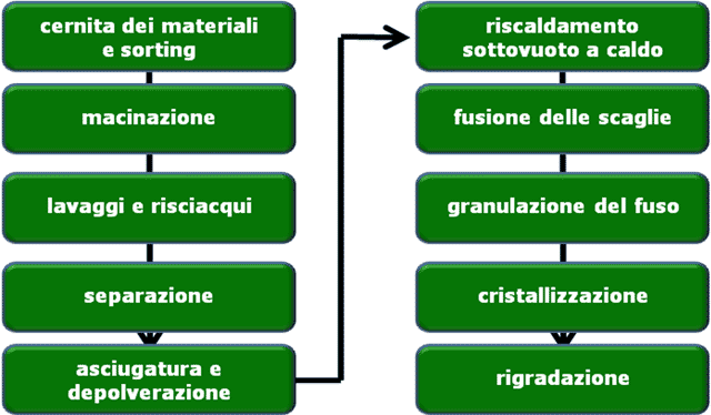 A valle della selezione (sorting), le diverse tipologie di contenitori in PET così ottenute sono dotate di proprie specifiche tecniche e commerciali, sono cioè prive di elementi estranei (se non in percentuali bassissime, rigidamente controllate), ma anche di residui di imballaggi in plastica in materiali diversi. I prodotti così selezionati, che sono comunque ancora rifiuto, sono il primo passo per arrivare alle nuove “materie prime seconde”, tra cui R-PET, oltre alle altre materie plastiche riciclate da aziende specializzate. I materiali, pressati in balle, vengono normalmente venduti su base d’asta alle aziende che effettuano il riciclo vero e proprio trasformando il rifiuto in un semilavorato disponibile in scaglie o granuli per la successiva trasformazione in manufatti. Entrando nel dettaglio del processo di riciclo, il materiale, ancora sotto forma di bottiglia intera, viene sottoposto al processo di riciclo che prevede vari cicli di lavaggio ed una macinazione da cui si ottengono scaglie (o flakes) di 4-10 millimetri. I lavaggi vengono effettuati ad alta temperatura (tra 70° e 90°) e con detergenti (soda caustica) in grado di eliminare etichette, impurità e qualsiasi tipo di residuo del contenuto. I vari lavaggi sono intervallati da fasi di risciacquo, filtrazione e separazione con l’obiettivo di arrivare ad ottenere una materia prima di alta qualità. Quindi si procede alla fase di asciugatura e poi a quella di depolverazione.