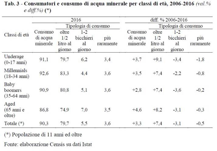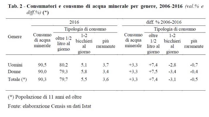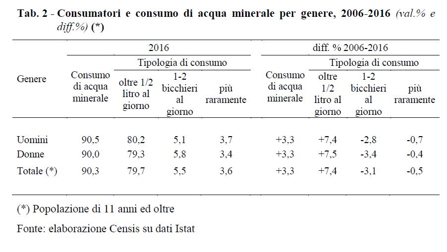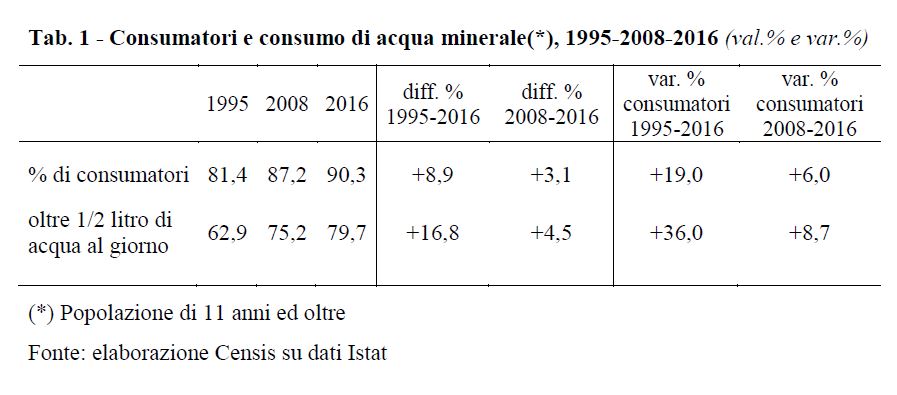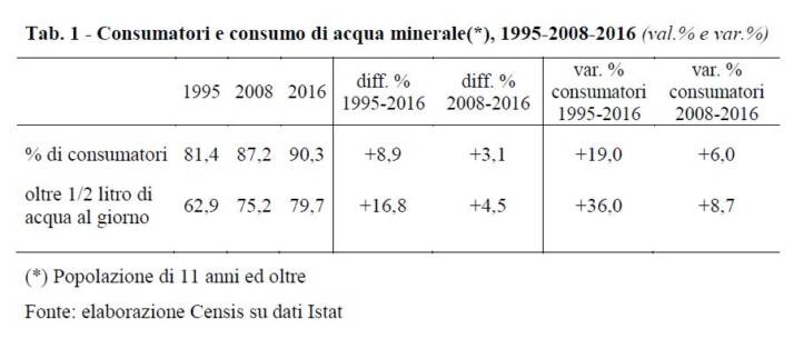 – nel periodo 1995-2016 i consumatori di acqua minerale tra le persone con almeno 11 anni sono passati dall’81,4% al 90,3%, un aumento boom di quasi 9 punti percentuali;