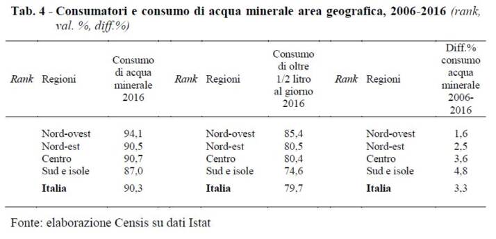 È al Nord-Ovest che si beve di più acqua minerale con il 94,1%, seguito da Centro (90,7%) , Nord-Est (90,5%) e Sud-Isole con quote pari all’87% dei residenti (tab. 4).