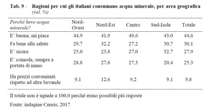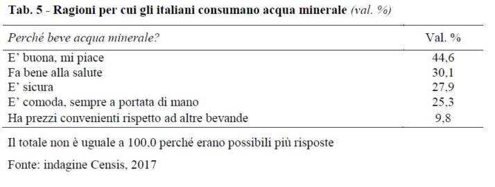 Il 44,6% degli italiani che consumano acqua minerale dichiara di berla perché è buona e gli piace, il 30,1% perché fa bene alla salute, il 27,9% perché è sicura, il 25,3% perché è comoda, sempre a portata di mano, il 9,8% per i prezzi convenienti rispetto a quelli di altre bevande (tab. 5).