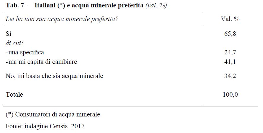 Colpisce la fedeltà ad una specifica acqua minerale, anche se magari ogni tanto viene cambiata, in un’epoca di infedeltà diffusa e crescente nel consumo; il fenomeno indica che i consumatori effettuano uno scrutinio molto rigoroso nella scelta dell’acqua minerale, probabilmente valutando in relazione alle proprie esigenze le varie soluzioni, finendo per enuclearne una di riferimento nell’ampia e articolata gamma di acque minerali disponibili sul mercato.