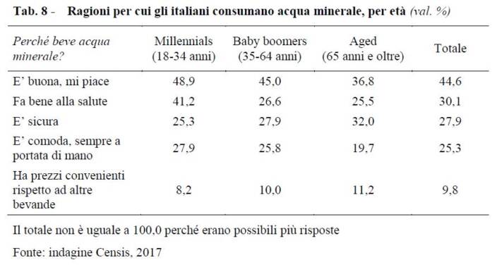 – l’acqua minerale è apprezzata dagli italiani in modo trasversale a genere, età, scolarità, condizione socioeconomica e area geografica di residenza. Il suo consumo è più forte di tutte le differenze e disuguaglianze che sempre più colpiscono il carrello e la tavola degli italiani;