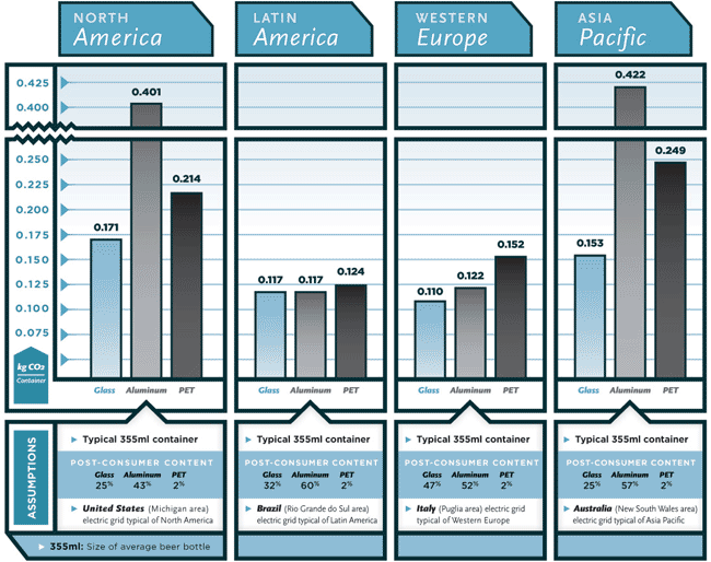 Per incoraggiare gli altri produttori di packaging a condividere le informazioni sul loro completo ciclo di vita, O-I ha anche calcolato il completo carbon footprint di alluminio e PET come parte integrante della sua LCA, usando dati disponibili e pubblici. La tabella mostra il carbon footprint della più utilizzata bottiglia al mondo per birra e soft drink (quella da 355 ml) misurato in kg di CO2 prodotta. Questo raffronto mostra che il vetro ha il più favorevole carbon foortprint in Nord America, Europa e Asia, mentre in America latina vetro e alluminio di equivalgono.