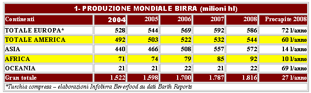 SOMMARIO: Anche nel 2008, nonostante lo scoppio della crisi finanziaria ed economica generale, il mercato mondiale della birra è riuscito a mettere a segno una crescita. Secondo i dati dell’ultimo Barth Report la produzione e il consumo mondiale di birra si è attestato nel 2008 a 1.816 milioni di ettolitri, con una progressione dell’1,6% rispetto all’anno precedente, inferiore però ai tassi medi di crescita (ca. 3% all’anno) del recente passato. I consumi hanno comunque frenato su alcuni grandi mercati, particolarmente nell’ultimo trimestre dell’anno. Il consumo pro-capite mondiale si consolida intorno ai 27 litri/anno. PRODUZIONE E CONSUMI