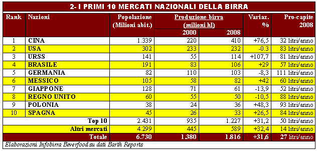 I primi 6 paesi produttori, pur rappresentando poco più di un terzo della popolazione mondiale, assorbono oltre i due terzi della produzione globale di birra. Al vertice di questa classifica si è da alcuni anni insediata la Cina (410 milioni di hl di produzione nel 2008) che, pur disponendo di un pro-capite di solo 32 litri annui, ha ormai superato, grazie all’enorme popolazione e a un tasso di sviluppo più vivace, il primato storico del mercato statunitense (oggi in seconda posizione con una produzione annua di 232 milioni hl). Negli ultimi 8 anni la Cina ha quasi raddoppiato produzione e consumi, mentre gli Usa sono rimasti fermi ai consumi di inizio secolo.