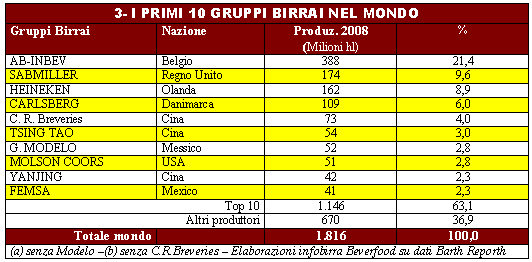 La produzione mondiale di birra è abbastanza frastagliata. Facendo riferimento solo ai birrifici industriali, il numero totale delle birrerie attive sul nostro pianeta è di almeno 4.000 unità, di cui circa 2.000 nella sola Europa. Tuttavia il quadro competitivo internazionale è caratterizzato da un intenso processo di concentrazione che si è accentuato negli ultimi dieci anni. Secondo la classifica annualmente stilata da “The Barth Report”, a fine 2008 i primi 10 produttori di birra assorbivano oltre il 63% della totale produzione mondiale, ma i primi quattro da soli concentravano il 46% del totale. L’attuale tasso di concentrazione è più basso rispetto al settore dei soft drink, ma è molto più elevato rispetto al settore del vino e dei superalcolici.
