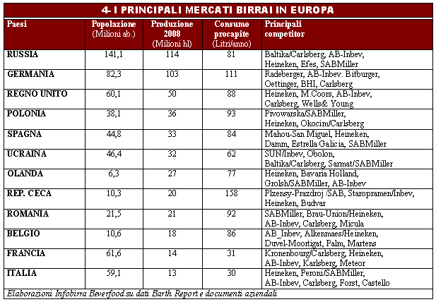 Il primato europeo nella produzione e nei consumi di birra è di recente passato dalla Germania alla Russia che negli ultimi 10 anni ha più che raddoppiato i volumi. Nel 2008 tuttavia, a causa della crisi economica, anche il mercato russo si è fermato e l’intera produzione continentale ne ha risentito, diminuendo i volumi rispetto al 2007. In generale i mercati più consolidati dell’Europa Occidentale mostrano segni di cedimento, mentre le prospettive di crescita riguardano i mercati dell’Est. In termini di consumo pro-capite si rileva una notevole variazione tra i vari mercati: si va dai 158 litri/anni della Rep. Ceca ai 30-31 dell’Italia e della Francia e ai 12 della Turchia. Queste notevoli differenziazioni sono connesse alle varie abitudini storiche nelle varie regioni, alle differenti tradizioni alimentari e gastronomiche, alle diverse disponibilità economiche, ma anche a differenti legislazioni che possono favorire o frenare il consumo della birra.