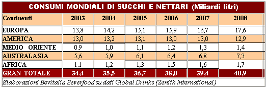 I succhi, in quanto bevande più ricche, sono mediamente più costosi delle semplici bibite e questo, unitamente a un minore supporto promo-comunicazionale (rispetto alle super pubblicizzate bibite gassate), determina una dimensione del mercato molto più contenuta. Secondo i dati di Global Drinks (Zenith International) la produzione e il consumo mondiale di succhi e nettari sono valutabili per il 2008 in circa 41 miliardi di litri, corrispondente a un pro-capite di poco più di 6 litri/anno. Negli ultimi anni il comparto si è sviluppato a tassi medi intorno al 3% annuo.