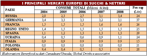 Il record nei consumi pro-capite è detenuto dai tedeschi (oltre 37 litri/anno di succhi & nettari), seguiti dai canadesi (34 litri/anno). Da sottolineare l’ottimo livello dei consumi pro-capite raggiunto in Russia, in linea con la media dei consumi pro-capite dell’Europa Occidentale. In Europa, oltre a Russia e Germania, emergono altri 7 mercati nazionali con volumi complessivi superiori ai 500 milioni di litri annui consumati. L’insieme di questi primi 9 mercati nazionali rappresenta oltre i 4/5 del totale consumi europei. In questa classica l’Italia segnala il più basso livello di consumo pro-capite (15 litri). Nell’Europa dell’Est le vendite mostrano un trend più positivo rispetto a quello dei paesi europei occidentali.