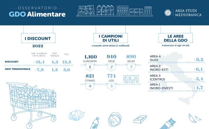 L’Area Studi Mediobanca presenta la nuova edizione dell’Osservatorio sulla GDO italiana e internazionale a prevalenza alimentare che aggrega i dati economico-patrimoniali di 129 aziende nazionali e 32 maggiori player internazionali per il periodo 2019-2022. Lo studio comprende approfondimenti sui singoli segmenti, un focus sui discount, sui prodotti a marchio del distributore (Mdd) e sulle relazioni tra retailer e industria. L’indagine completa è disponibile per il download sul sito www.areastudimediobanca.com