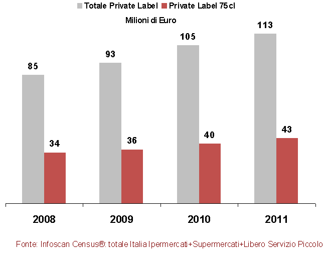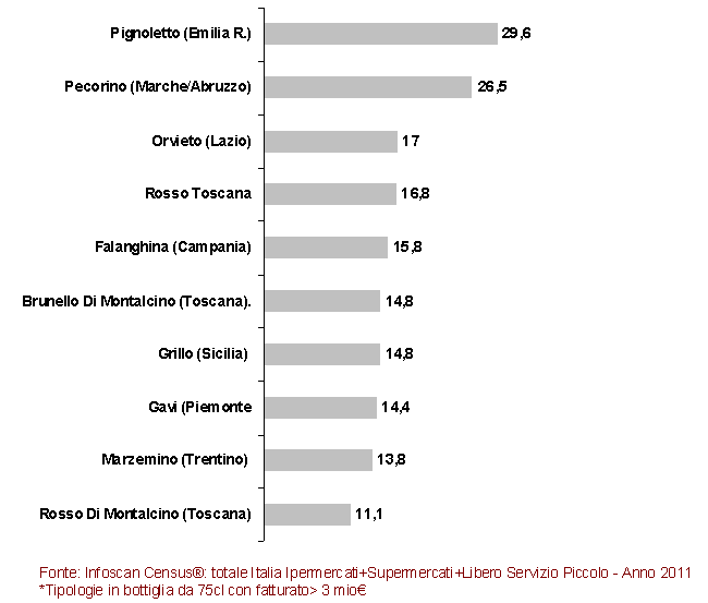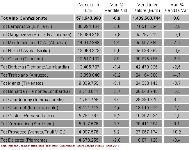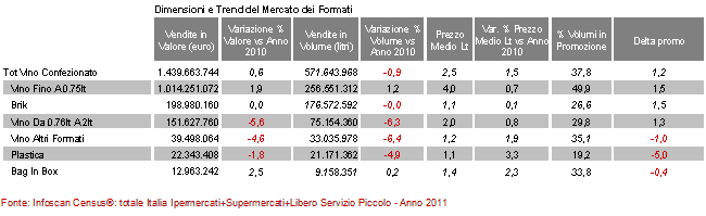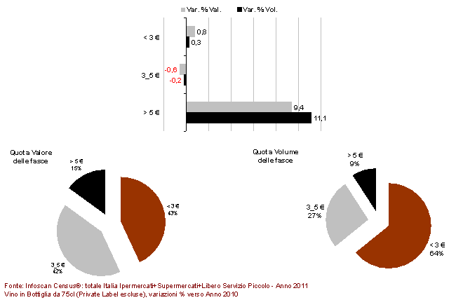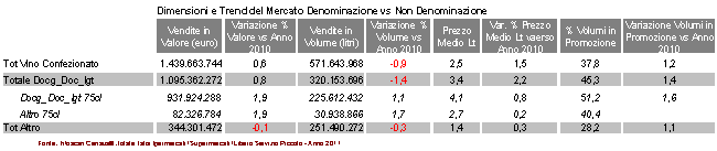 Valutazioni analoghe sono state espresse da Virgilio Romano, Client Service Director di SymphonyIRI Group: “Le vendite di vino nella Gdo nel 2011 sono in linea con l’andamento dei consumi di vino nel Paese, con volumi in leggera contrazione e valori in crescita, confermando il trend in atto legato alla ricerca della qualità. Due gli aspetti da sottolineare: l’importanza che hanno i vini con prezzo a bottiglia inferiore ai 3 euro e la conferma della crescita dei vini con prezzo medio-alto (sopra i 5 euro). Si può parlare dunque di polarizzazione nelle scelte dei consumatori, fenomeno osservato nel 2011 in altre categorie, che andrà valutata nei prossimi mesi per misurare l’effetto derivante dal superamento della soglia dei 5 euro nel corso del 2011 ad opera di alcuni attori importanti che potrebbero aver accentuato un trend in ogni caso positivo”.