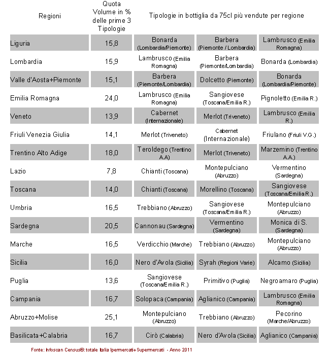 Tab. 6 Tipologie in Bottiglia da 75cl più vendute per regione