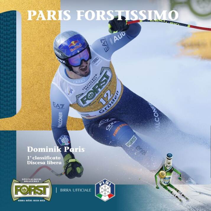 Anche sui social è rimbalzato il binomio azzurro Paris-Forst. “”Paris Fortsissimo”, ha titolato sui canali social ufficiali del birrificio con un bel gioco di parole, con tanto di post in tedesco e in italiano. “Dominik Paris incanta la nostra amata Val Gardena aggiudicandosi il primo gradino del podio nella gara di Discesa Libera. Un brindisi speciale a questa performance emozionante e congratulazioni da Birra FORST. Prosit!”.