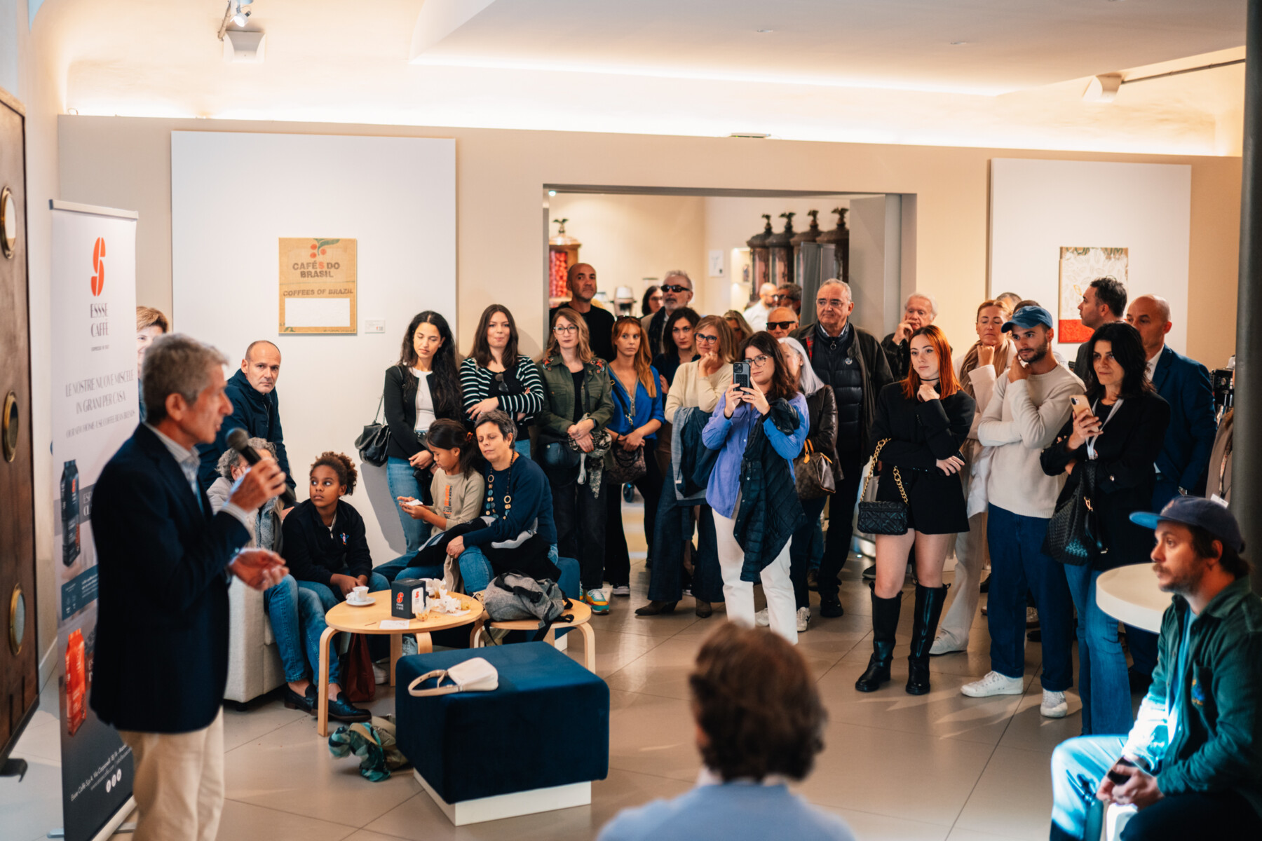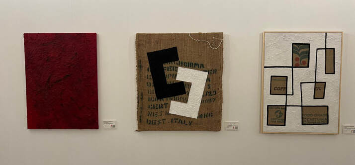 Negli splendidi interni dello shop, aperto al pubblico dal 2015, è stata allestita una mostra dell’artista toscano Andrea Polenta, che ha utilizzato materiale di scarto della lavorazione del caffè e sacchi di juta, per trasformare in opere d’arte uniche, riconoscibili e sostenibili. Arte dunque circolare e polisensoriale, ogni opera ha odore, colore e texture differente.