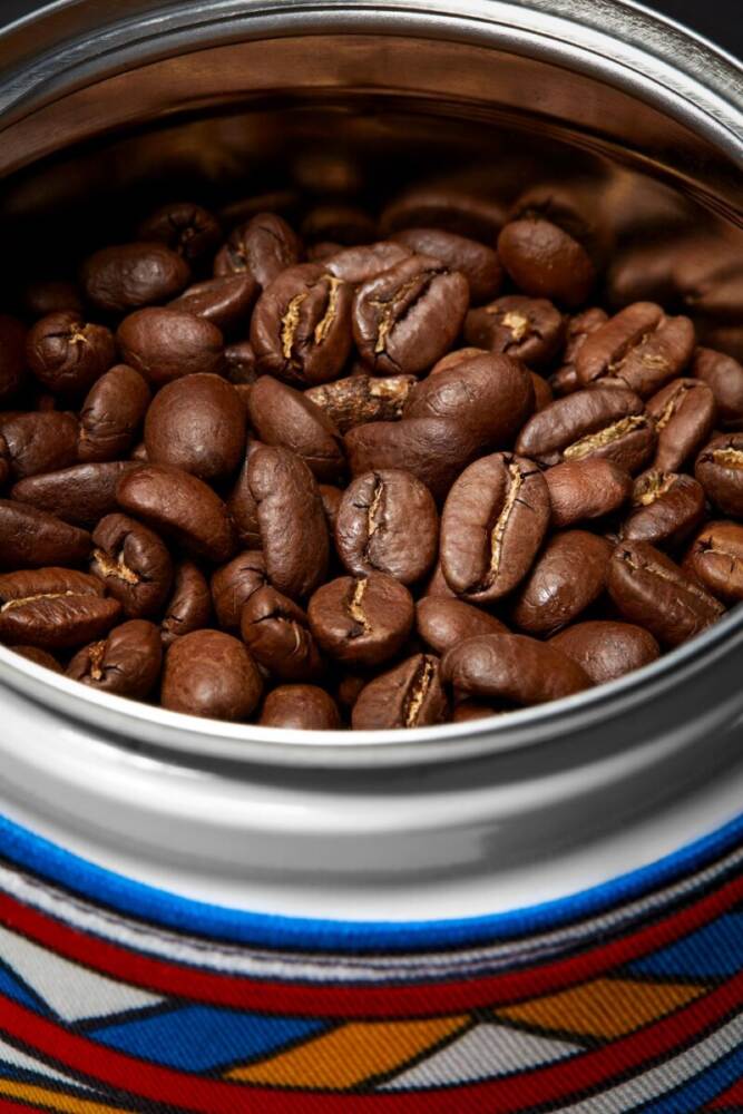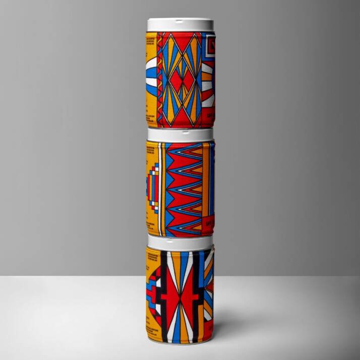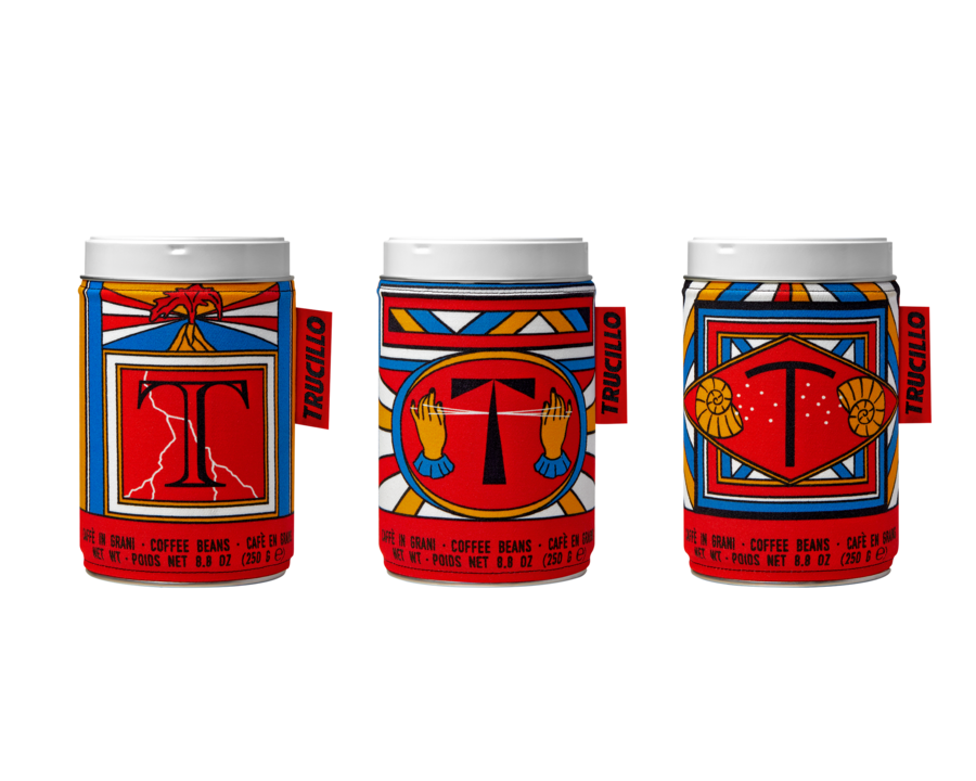 Questa bellezza composita e viva si esprime nel coloratissimo design del barattolo. L’involucro esterno è realizzato in tessuto da sarti del territorio, artigiani da tre generazioni. I colori caldi richiamano i Paesi di provenienza del caffè mentre i simboli rappresentano i ricordi accumulati da Antonia Trucillo nei suoi numerosi viaggi in piantagione. Esplosione, legame e contaminazione sono il comune denominatore dei chicchi di caffè contenuti nel barattolo e ne diventano il nuovo vestito, una bandiera simbolica. Lo studio Lettera7 ha saputo tradurre in design la giusta sinestesia tra le forme geometriche e i simbolismi tribali che raccontano le storie dei caficultores incontrati in questi viaggi.