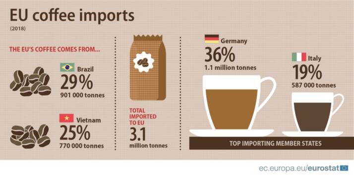 La maggior parte del caffè importato nel 2018 da paesi extra UE proveniva da due paesi: Brasile (901000 tonnellate importate nell’UE, pari al 29% delle importazioni extra-UE totali) e Vietnam (770000 tonnellate, 25%). Seguono Honduras (228000 tonnellate, 7%), Colombia (173000 tonnellate, 6%), Uganda (161000 tonnellate, 5%), India (157000 tonnellate, 5%), Perù (127000 tonnellate, 4%) e Etiopia (87000 tonnellate, 3%).